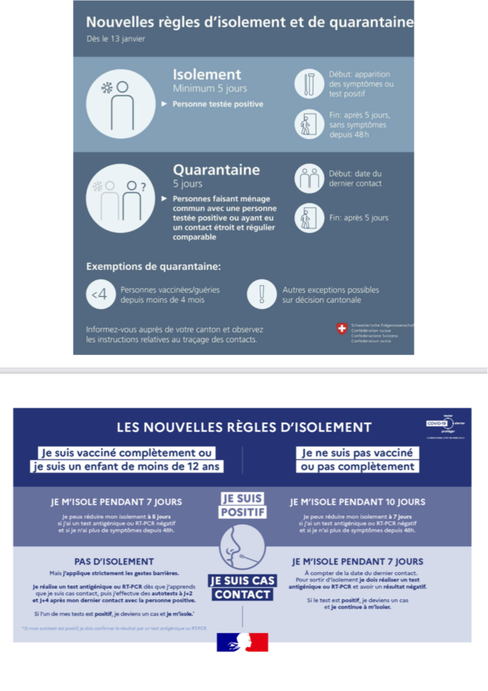 Pour donner suite aux nouvelles mesures prises par la confédération, voici les règles à adopter en matière d’isolement et de quarantaine pour les résidents Suisses. Pour les personnes domiciliées à l’étranger nous appliquons les mesures de leurs lieux de résidence.